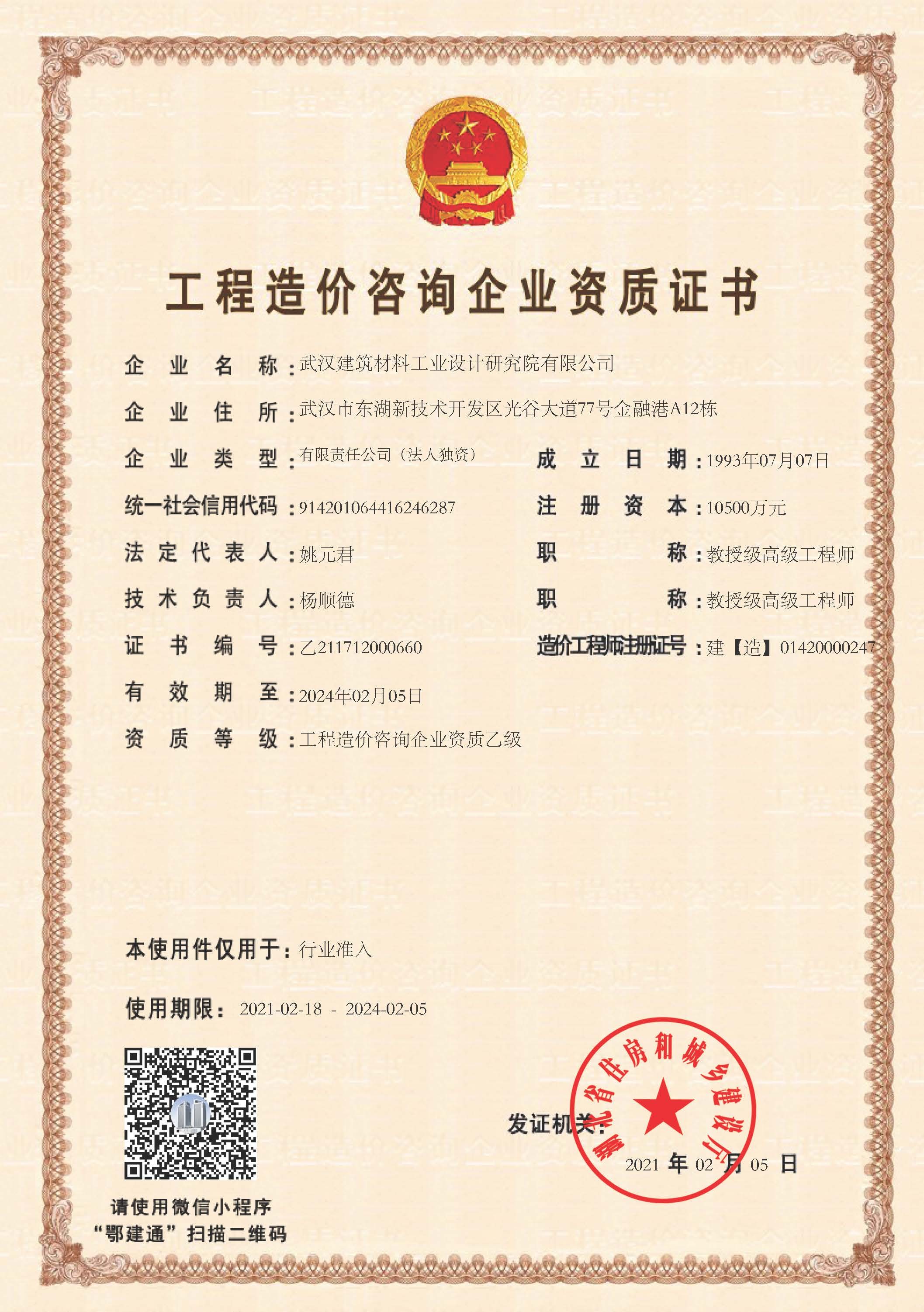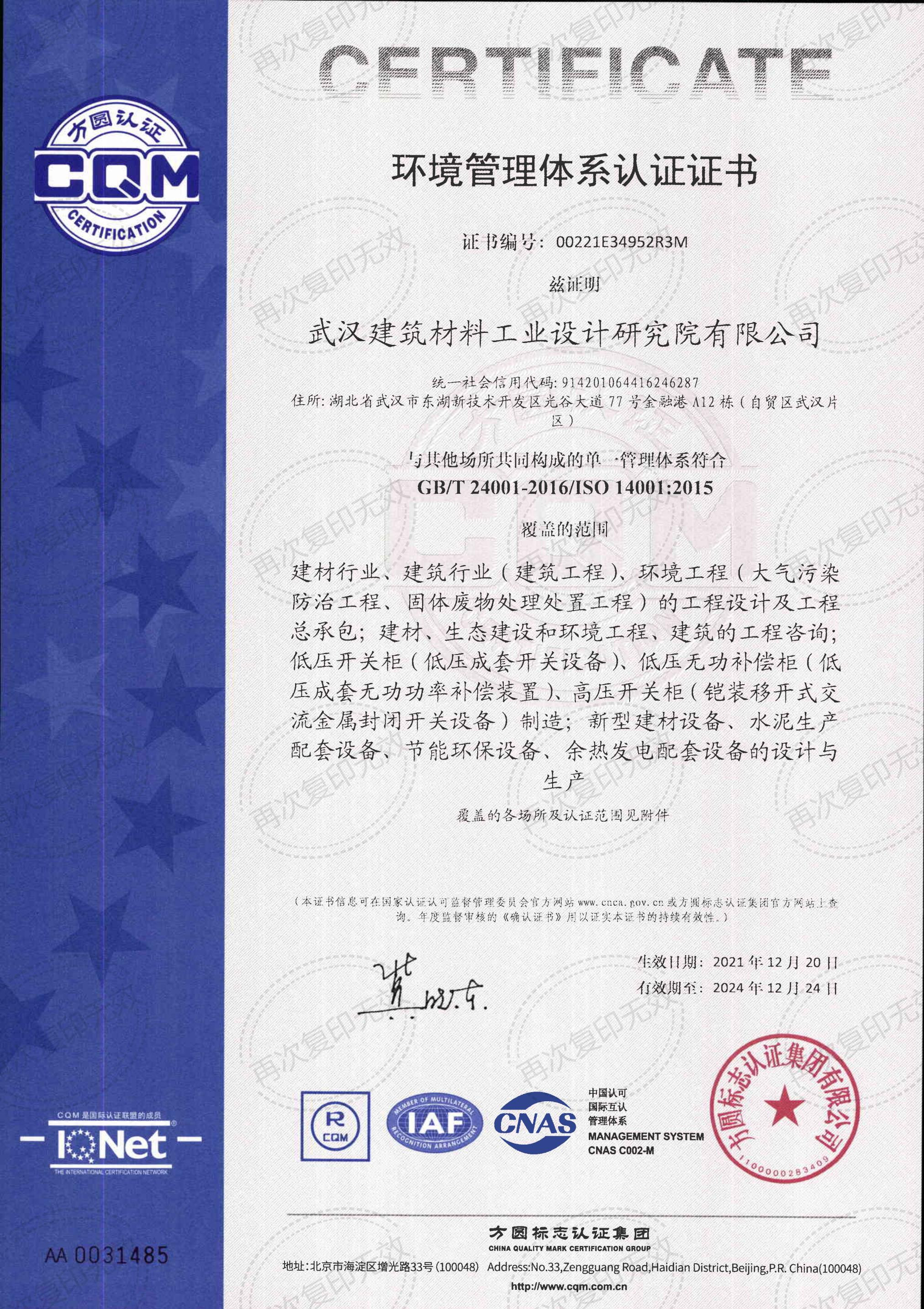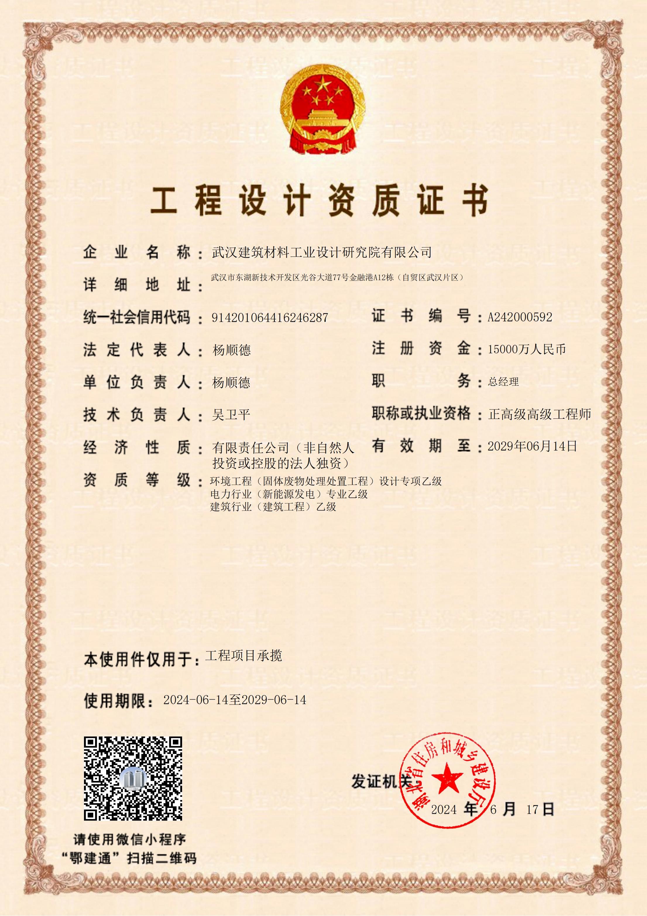 工程設計甲級資質證書(建材行業;環境工程)