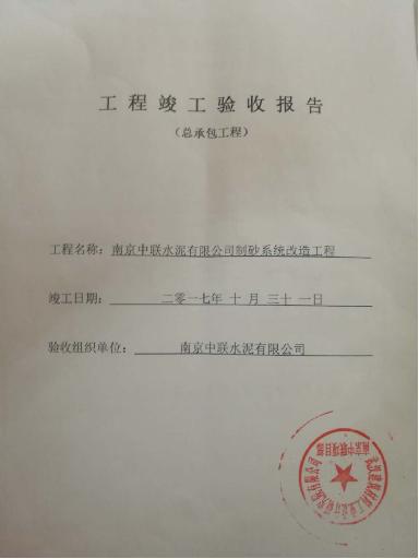 2018年1月18日,由我院總承包的“南京中聯水泥有限公司制砂系統改造工程”順利通過性能測試,完成竣工驗收,工程合格率100%,顆粒級配符合國家標準,工藝系統滿足業主要求。
