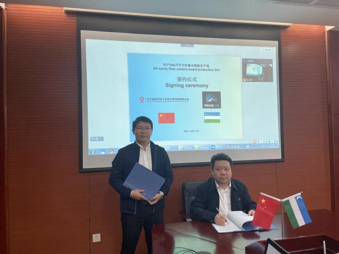 ?? 近日,武漢建筑材料工業(yè)設(shè)計(jì)研究院有限公司(以下簡(jiǎn)稱“武漢建材院”)與PRIME ML公司(以下簡(jiǎn)稱“PRIME ML”)就烏茲別克斯坦500萬(wàn)平米/年纖維水泥板生產(chǎn)線項(xiàng)目在我公司舉行了云簽約儀式,PRIME ML公司總經(jīng)理Mukhamedov Aziz 、武漢建材院黨委書記白寧、新材事業(yè)部市場(chǎng)部副部長(zhǎng)邵燁出席簽約儀式。