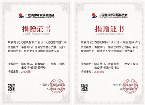 公司團委向希望工程抗擊疫情特別關(guān)愛行動 項目捐款證書