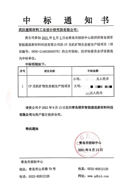 在武漢建材院新一屆領導班子的帶領下,新材事業部團隊經過艱苦努力,成功中標青島領軍智能建造新材料科技有限公司平度綠色新型建材產業園年產500萬平方纖維水泥板生產線EPC總承包建設項目。