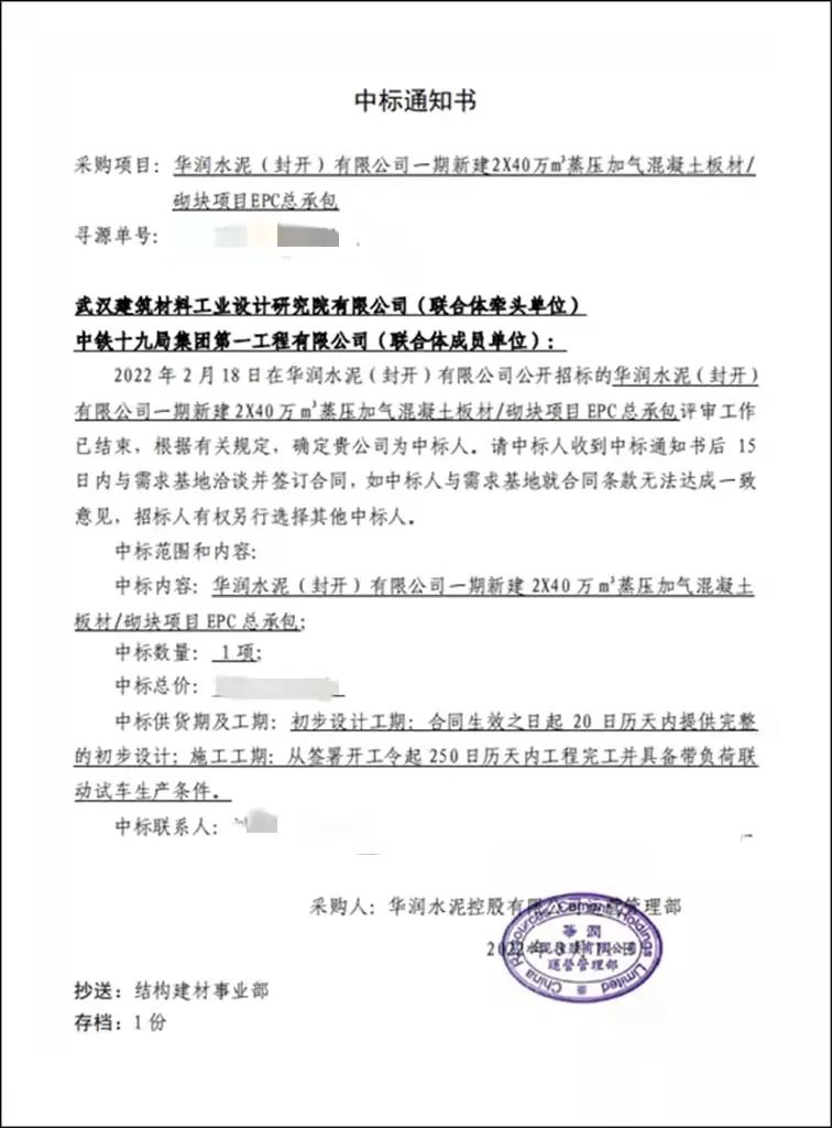 3月9日,中材節(jié)能所屬武漢建筑材料工業(yè)設(shè)計研究院有限公司(以下簡稱“武漢建材院”)成功中標(biāo)華潤水泥(封開)有限公司一期新建2×40萬m³蒸壓加氣混凝土板材/砌塊項(xiàng)目EPC總承包工程。該項(xiàng)目是武漢建材院近年來在新材領(lǐng)域合同金額最大的項(xiàng)目,這不僅是武漢建材院與華潤水泥進(jìn)一步深化合作的里程碑,更是武漢建材院在加氣混凝土行業(yè)堅(jiān)持不懈、厚積薄發(fā)、引領(lǐng)發(fā)展的充分體現(xiàn)。