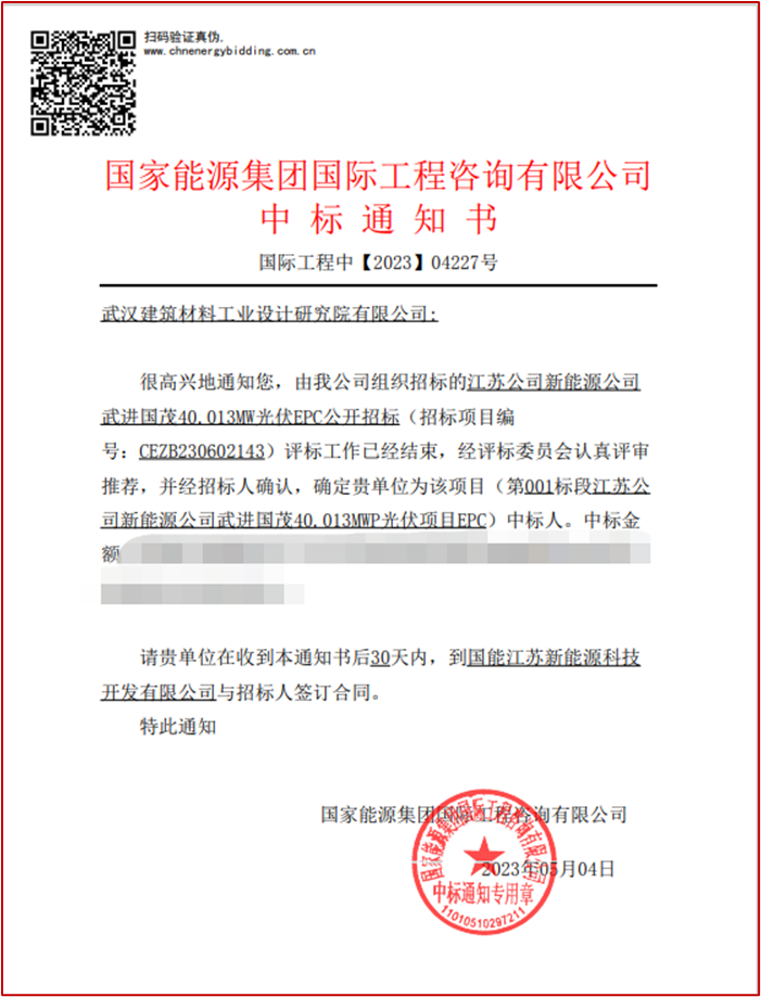 近日,武漢建材院中標國能江蘇新能源科技開發有限公司(以下簡稱“國能江蘇新能源公司”)武進國茂40.013MWP光伏EPC項目。